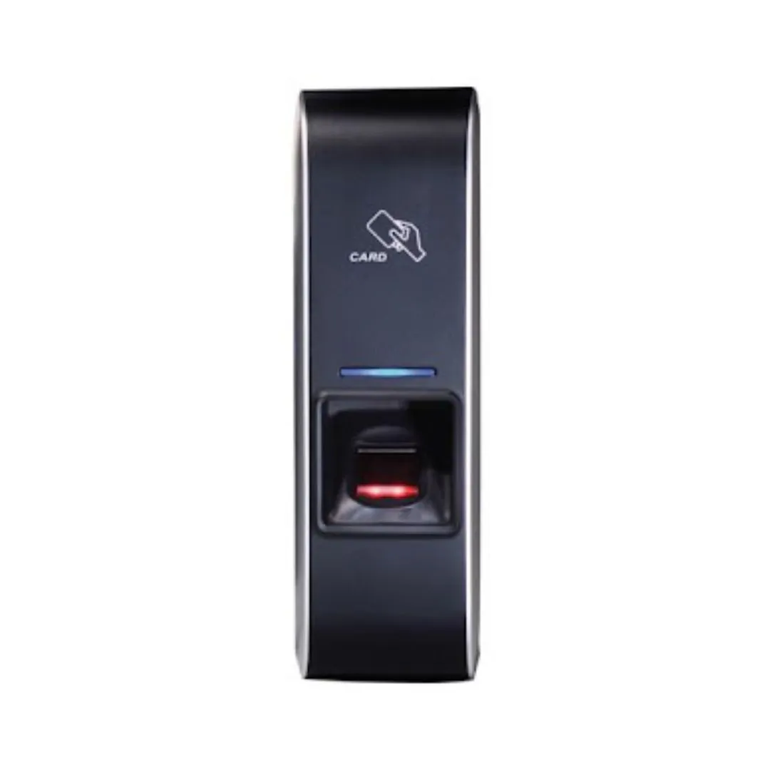 This is a slim-design fingerprint reader for installation on door frames. It is compatible with a full range of access-control applications, from a simple standalone door control to complex, networked access-control systems